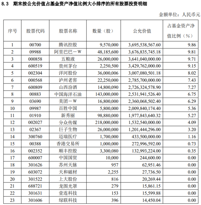 3月底,易方达蓝筹精选混合基金披露了年报,前10大重仓股分别是:腾讯控股、阿里巴巴、五粮液、贵州茅台、洋河股份、泸州老窖、山西汾酒、中国海洋石油、美团、百胜中国。