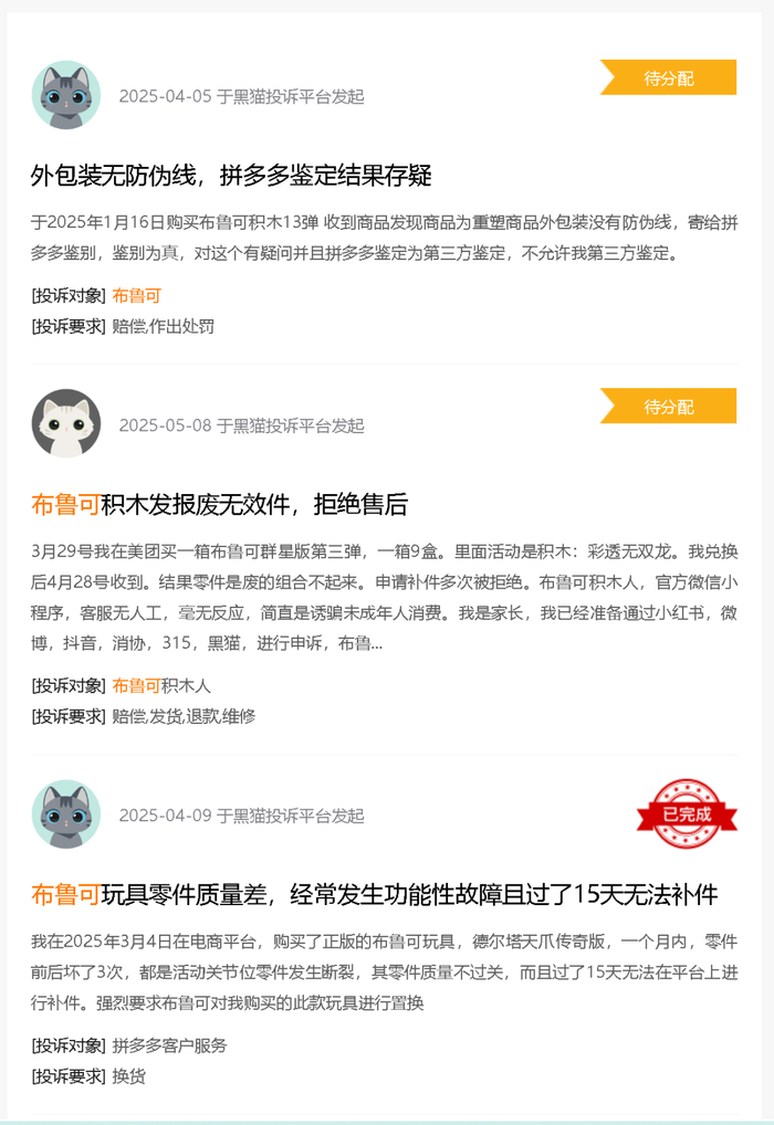 卖的多了,投诉自然也多。在黑猫投诉[下载黑猫投诉客户端]平台,有不少人投诉布鲁可玩具的质量问题。