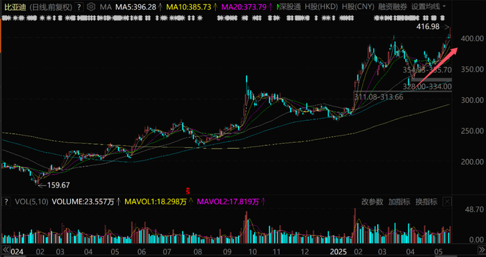 昨天,比亚迪盘中创出历史新高,今天中午一度又大涨超过4%,收盘上涨1.55%。