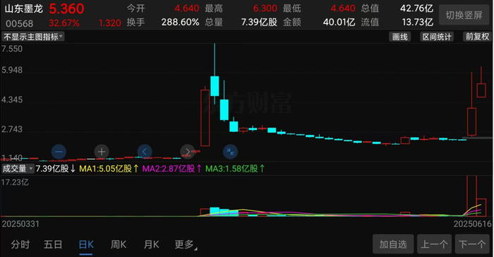 今天,山东墨龙港股继续高开高走,开盘高开约15%后直线拉升超55%,两日最高涨幅超174%。