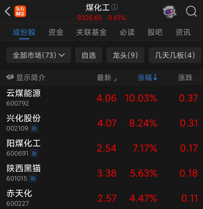 煤化工板块的金牛化工、云煤能源同样已经连续两天涨停,兴化股份盘中涨停微盘炸板收涨8.24%,阳煤化工、陕西黑猫今天大涨超5%。