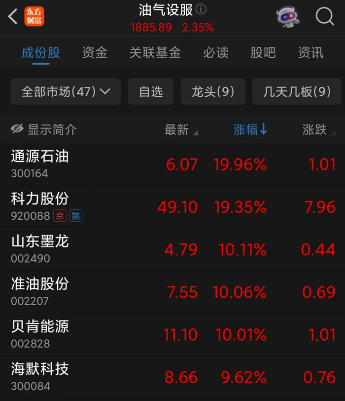 其中,北交所的科力股份盘中触及30%涨停板、收盘仍涨超19%,创业板通源石油20%涨停,海默科技盘中触及20%涨停、收盘仍超9%,山东墨龙、准油股份、贝肯能源、洲际油气涨停,新锦动力盘中一度涨超17%、收盘涨超7%。