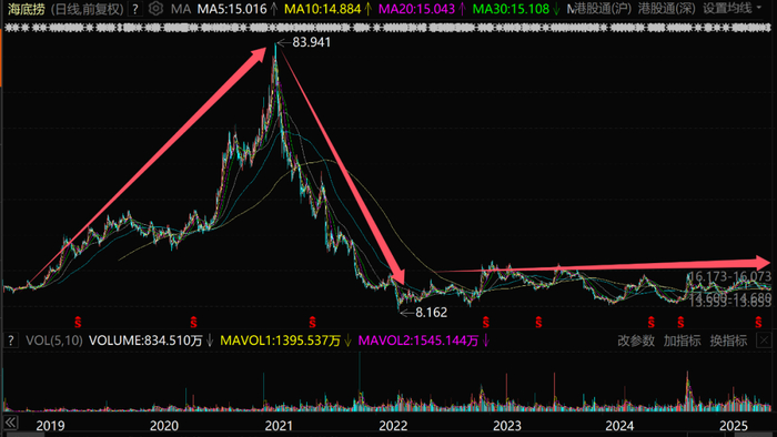你可以说海底捞的暴跌跟当时疫情有关,但现在海底捞也只有15港元,较历史高点下跌高达80%,远远没有恢复元气。