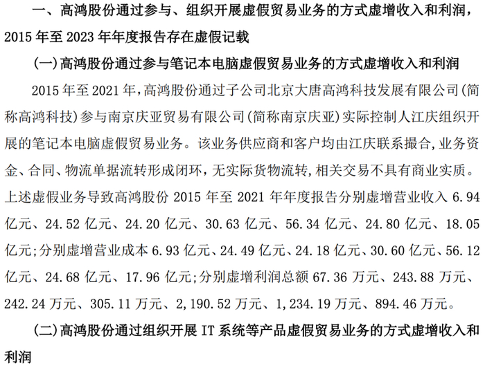 笔记本虚假贸易通过高鸿股份子公司高鸿科技与南京庆亚实控人江庆进行,业务资金、合同、物流单据流转形成闭环,无实际货物流转,相关业务不具有商业实质。IT系统虚假贸易更是有多家子公司参与,包括高鸿数据、高鸿恒昌、高鸿鼎恒、高鸿鼎远,但通过IT系统业务虚假贸易造假主要是从2018年开始的。