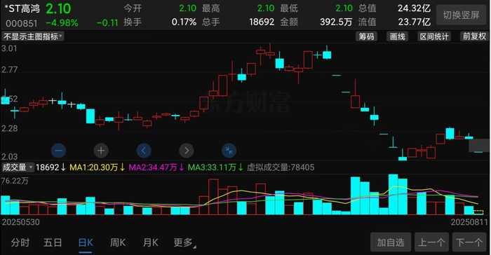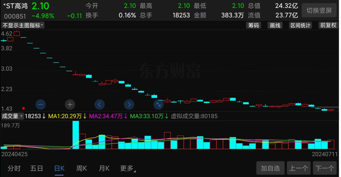 值得一提的是,高鸿股份在被ST时曾出现连续8个跌停板的极端行情,股价短暂止跌之后又继续极端杀跌,从2024年5月6日被ST到2024年7月11日止跌上涨,期间出现了23个跌停板。