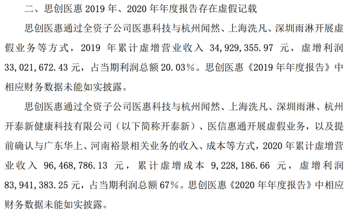 2024年1月9日,思创医惠收到《行政处罚决定书》和《市场禁入决定书》,经查明,2019年虚增营收3492.94万、虚增利润3302.17万,2020年1-9月虚增营收6096万、虚增利润5237万,2020年全年虚增营收9646.88万、虚增净利润8394.14万。