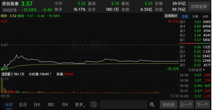(思创医惠公告截图)受此消息影响,今天思创医惠股价开盘即闪崩低开近20%,盘中虽一度回升至-6%左右,但全天仍跌超10%。