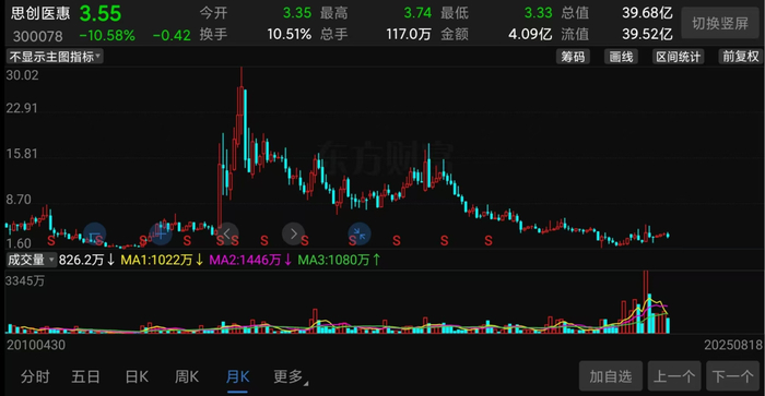 思创医惠上市之后,2010年-2013年期间最大暴跌超89%,2015年牛市顶点至今股价最大跌幅超93%。