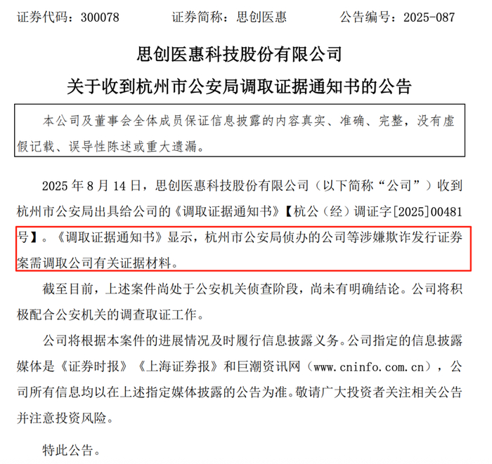 8月15日思创医惠发布的一份公告证实了投资者一直以来的质疑,思创医惠因涉嫌欺诈发行证券收到了《调取证据通知书》。