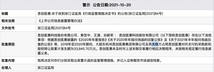 早在2021年10月20日,思创医惠就因为大股东思创医惠集团及其关联方占用思创医惠对外支付的采购款和股权转让款累计发生额为3.38亿,被浙江证监局出具警示函。