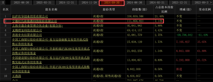 2021年7月,宁德时代通过定向增发的方式认购先导智能股份,成为其重要的战略投资者,持股比例为7.15%,位列第三大股东。在2024年三季度,宁德时代以7.14%的持股比例,位列第二大股东。
