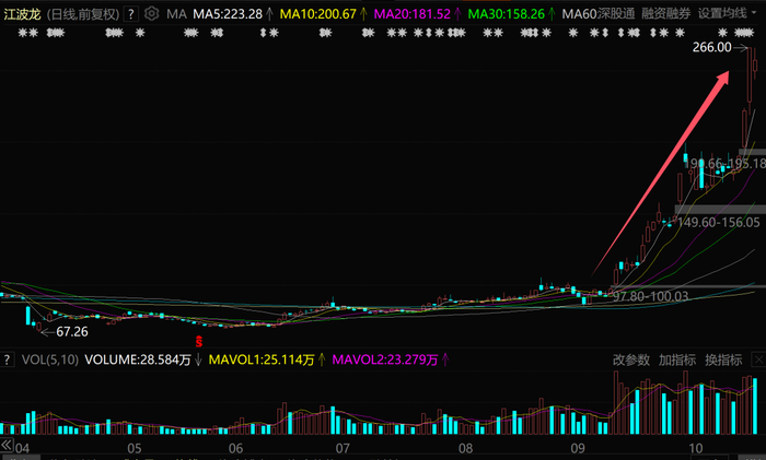 自9月初股价启动以来,江波龙从不到90元一度涨到266元,一个多月涨幅超过200%。