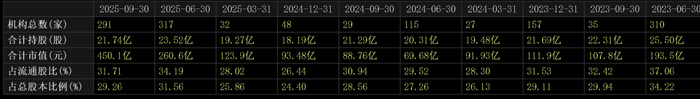 机构的持股市值在一、二、三季度末分别为123.9亿元、260.6亿元、450.1亿元,环比大幅增加。