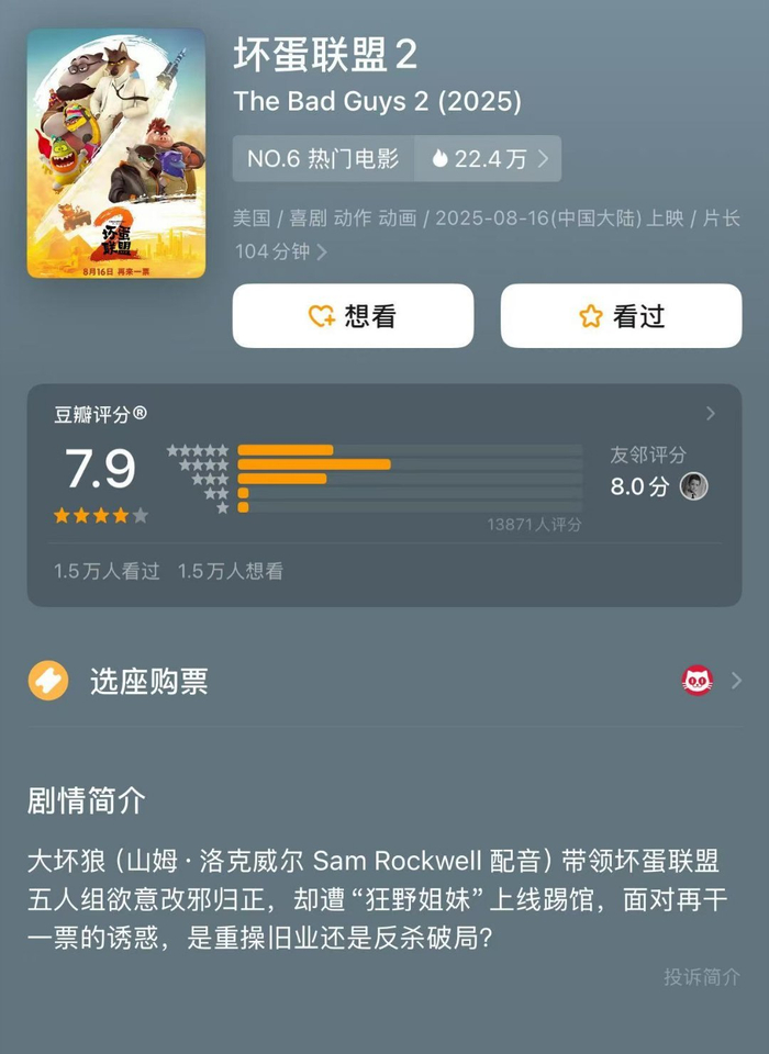 续集逆袭!《坏蛋联盟2》豆瓣开分比第一部高出0.5分,萌贱天团全员回归笑点升级,合家欢动画天花板实至名归!