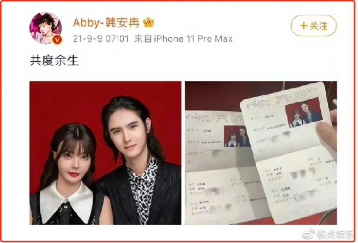 2021年9月9日,韩安冉高调宣布与马泽鑫结婚。