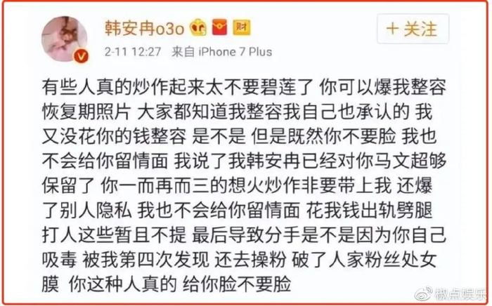 韩安冉大大方方承认自己就是整容了,然后在博文里把马文超骂得狗血喷头。
