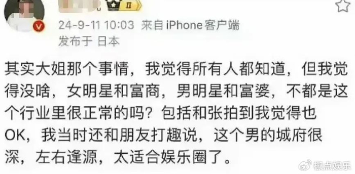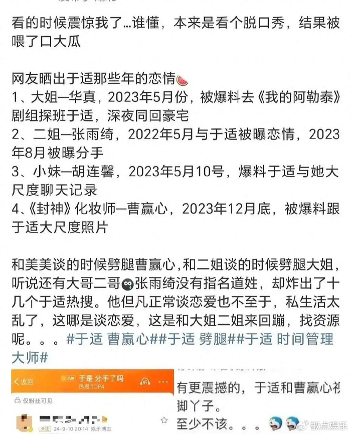 更令人震惊的是,在于适与这些富婆交往之前,他还曾与一位女网红有过一段长时间的同居生活。直到遇见富婆团后,他才与女网红分手。这一系列事件不仅揭示了于适复杂的私人生活,也让人对其道德品质产生了严重的质疑。
