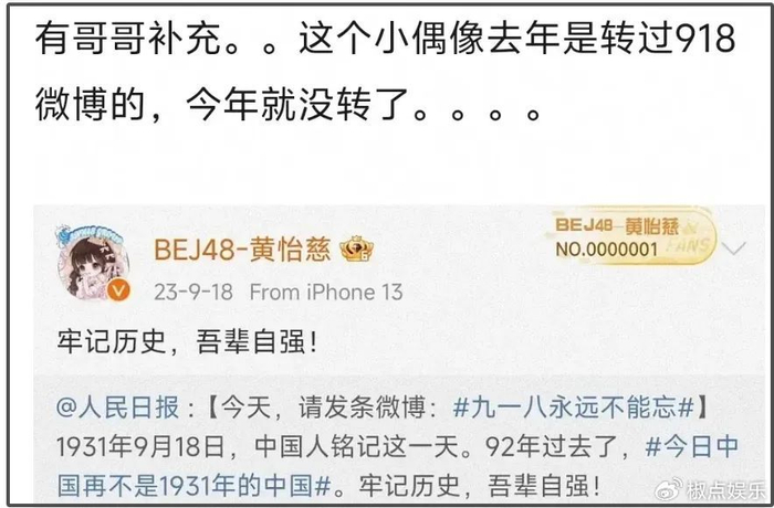 随着事件的持续发酵,网友们开始深入挖掘黄怡慈的过往行为。他们发现,黄怡慈并非初犯,早在去年“九一八”期间,她就曾转发过相关微博,表示不能忘记历史。