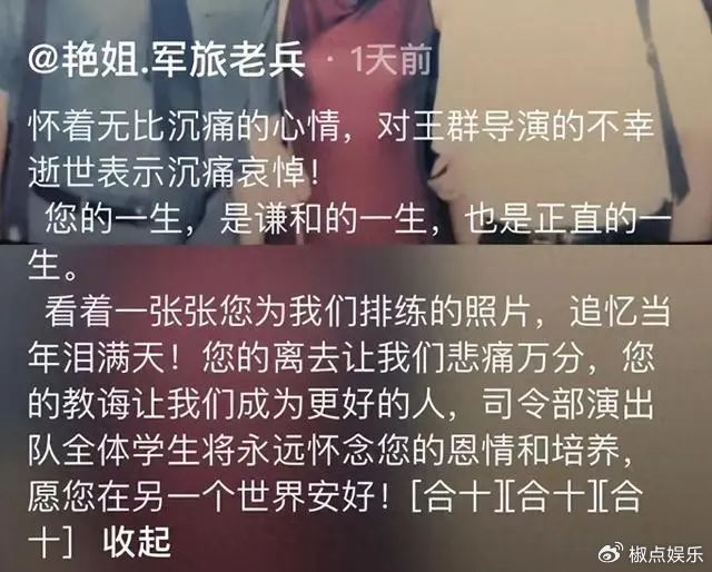 艳姐在文案中深情回忆了与王群的过往,她写道:“翻看一张张您指导我们排练的照片,往昔涌上心头,泪水夺眶而出。”