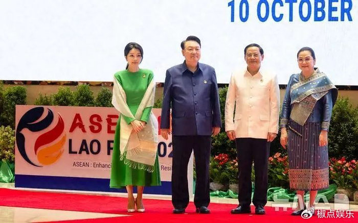 这不仅使她在众多第一夫人中显得格外出众,同时也巧妙契合了东盟峰会的主题色调。金建希在服装选择上的精心用意,充分体现了她对这次峰会的高度重视。