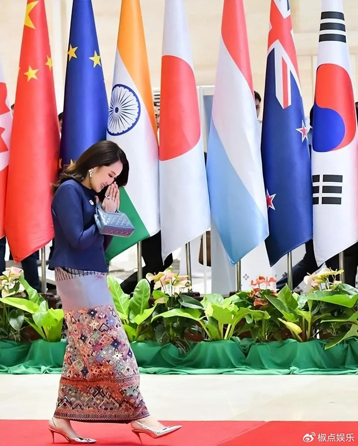 贝东丹作为泰国总理,加上形象如此好,这次在东盟峰会上非常出风头。她不仅在大合影中轻松抢镜,更在晚宴上展现了她的领袖风范。