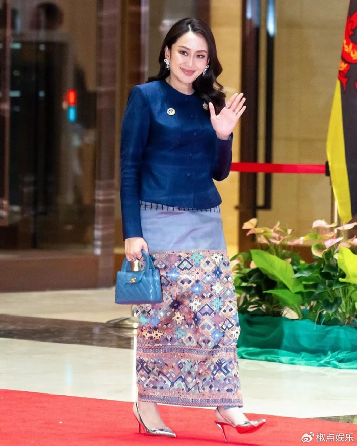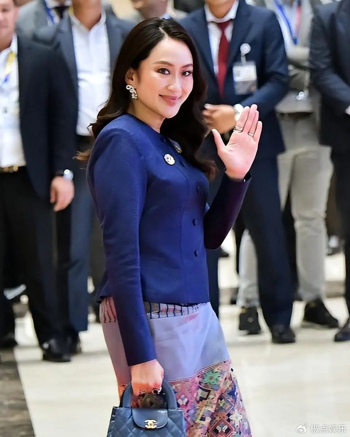 而在晚宴上,她则换上了传统的泰国裙装,蓝色的上衣搭配印花刺绣半裙,再加上蓝色的手拎包,既能展现出自己国家的特色,又凸显了她前凸后翘的好身材。