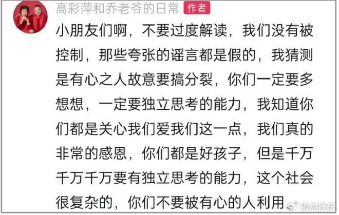 此次乔爸乔妈站出来发声,不仅为王思聪、林更新等人洗清冤屈,也让更多人看到了谣言的危害。