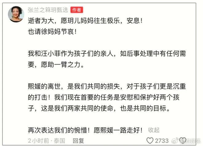 在大S离世后,其前婆婆张兰发文悼念:“熙媛的离世,是我们共同的损失,对于孩子们更是沉重的打击!我们现在首要的任务是安慰和保护好两个孩子,这是我们两家共同的使命,也是共同的目标。”