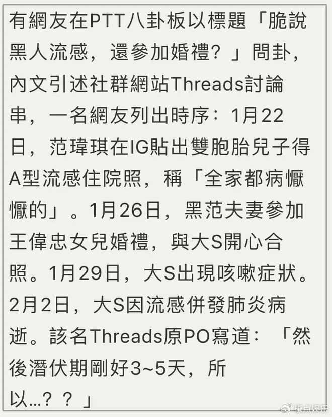 随后,大S确诊甲型流感,但并未接受更为深入的治疗,只是开了一些药物。