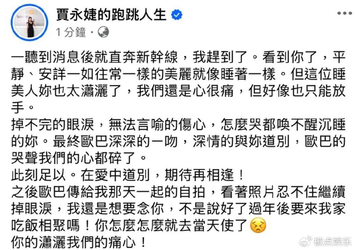 在大S离世后,家人和亲友纷纷发文悼念和缅怀她。大S好友贾永婕发文称,自己前去日本送别大S,心情无比悲痛;大S老公具俊晔也在现场,他深深亲吻大S做最后告别,痛哭不已。