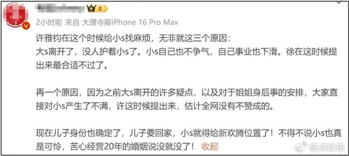 事实上,许雅钧的私生子传闻并非首次出现。早在之前,汪小菲就曾发文,暗示许雅钧拿着小S的钱在上海有另一个家。