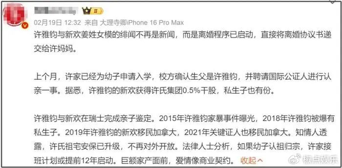 就在大S遗产争夺大战打得如火如荼之时,许雅钧的私生子传闻再次甚嚣尘上,成为了大众关注的焦点。
