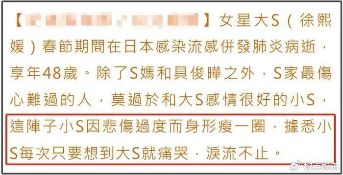 据台媒报道,小S因为悲伤过度,整个人的状态变得极其糟糕。她的身体迅速暴瘦,原本圆润的脸庞变得憔悴不堪,眼神中也充满了悲伤和疲惫。她常常会在不经意间想起姐姐,然后忍不住痛哭流涕,情绪完全失控。