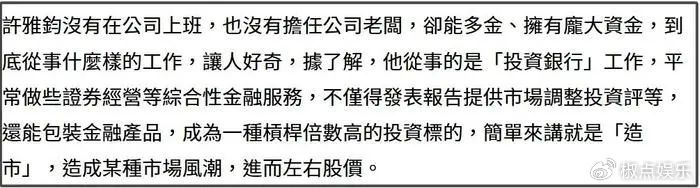 更令人震惊的是,私生子还获得许氏集团0.5%的干股。虽然许雅钧似乎一直承继父业以炒股为生,并没有在公司担任实质性的管理职务,但这干股的给予,足以显示出许家对这个孩子的态度。还意味着这个私生子在许氏家族中,将拥有一定的地位和话语权。