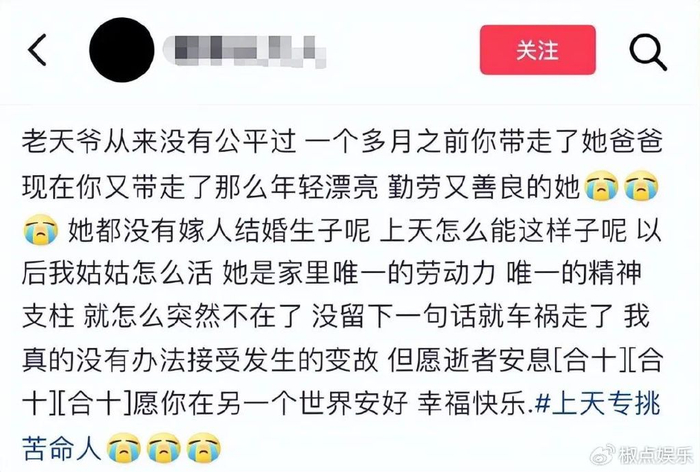 可命运这个“大反派”,又给了她致命一击。2025年2月6日,一场车祸,就这么把她年轻的生命带走了。
