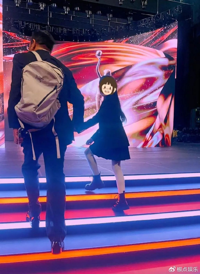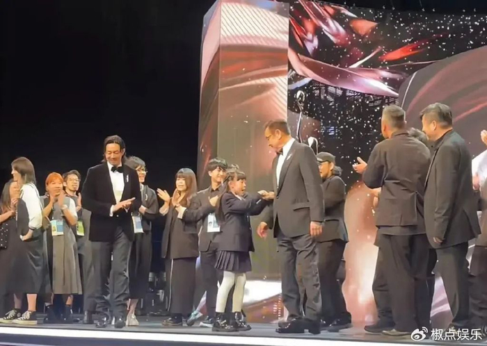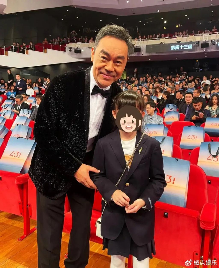 小家伙穿着黑色套装,活泼可爱,个头都快到爸爸手肘那儿了。她不但和影帝刘青云亲切合影,还和多位演员谈笑风生。