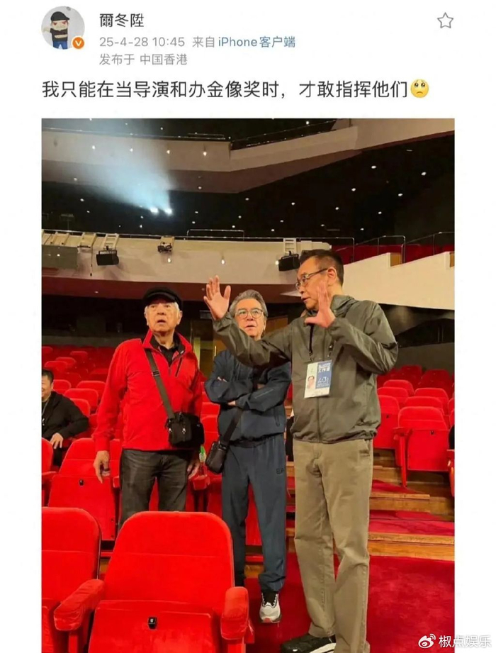 前阵子,尔冬升在微博晒出和秦沛、姜大卫两位哥哥,在金像奖现场的合照,配文那叫一个有趣:“我只能在当导演和办金像奖时,才敢指挥他们。”