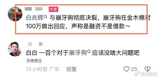 事情曝光后,远在老挝的崩牙驹也坐不住了,出来回应了。他倒好,直接说这100万不是借款,而是融资。嘿,这理由可真够牵强的,要是融资,那总得有个投资项目吧?总得让投资人看到点希望吧?