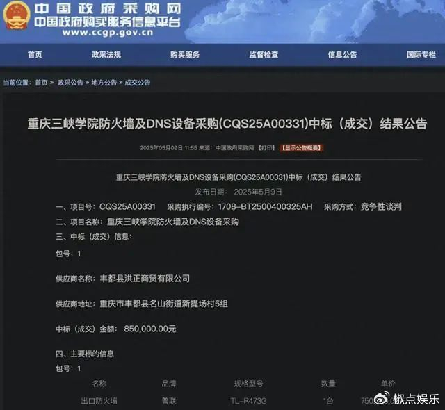 事情是这样的,有网友在政府采购网上发现了一份 “宝藏” 中标公告。公告显示,重庆三峡学院通过竞争性谈判,打算花75万买一台普联 “TL - R473G”出口防火墙,供应商是丰都县洪正商贸有限公司,整个中标价格更是高达85万。