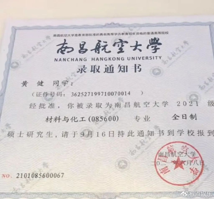黄健的人生,曾是妥妥的“别人家孩子”模板。2021年,当母亲在朋友圈晒出他的南昌航空大学硕士录取通知书时,亲友们纷纷点赞:“这小子将来肯定有出息!”