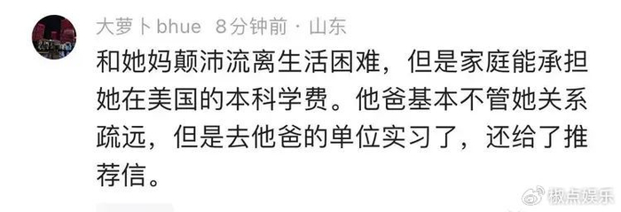 还提到自己摇号,进了青岛一所“不好的学校”,同学大多是农民工子弟和小摊贩的孩子,放学就得去帮父母看摊位。咱就纳闷了,这是想表达自己 “出淤泥而不染”,还是想卖惨博同情呢?