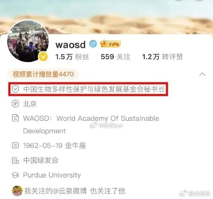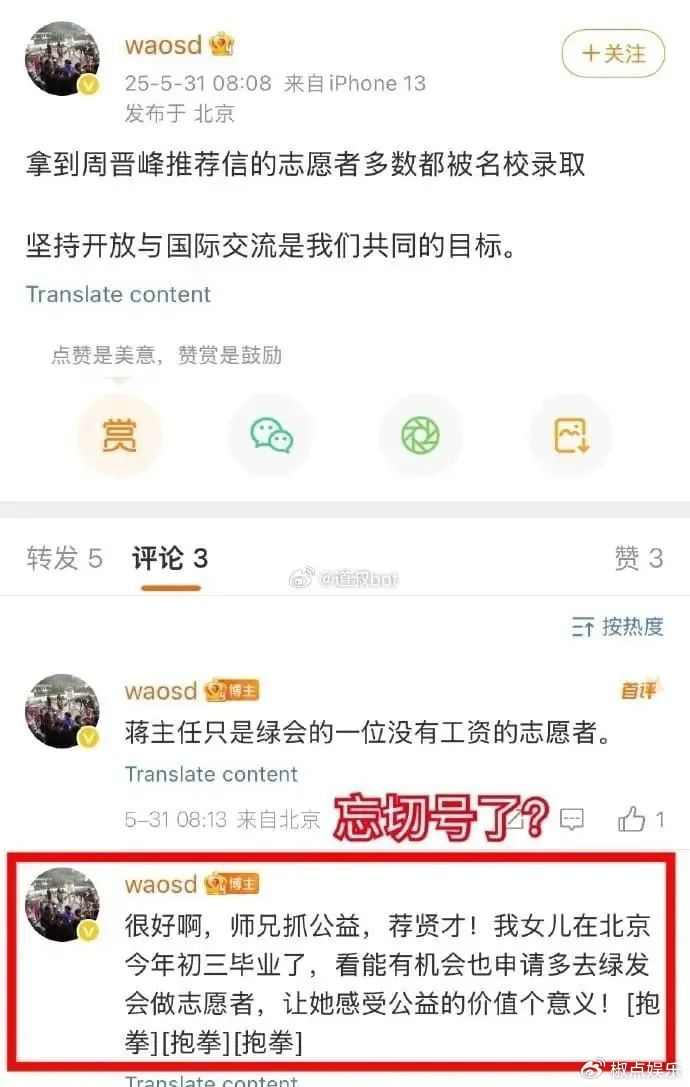 很快,眼尖的网友就扒出,这个“@waosd”的微博认证信息,竟然是绿发会秘书长周晋峰,而他正是推荐蒋雨融,进入哈佛肯尼迪学院的关键人物。