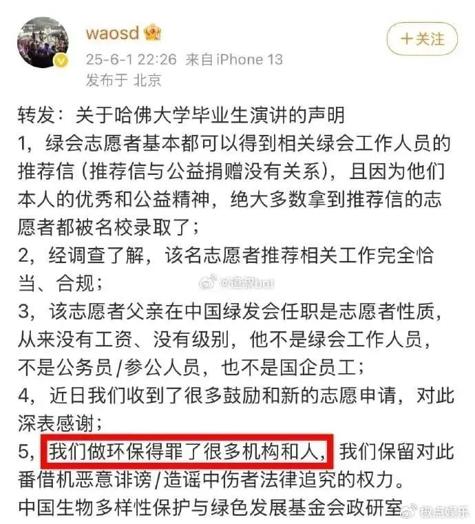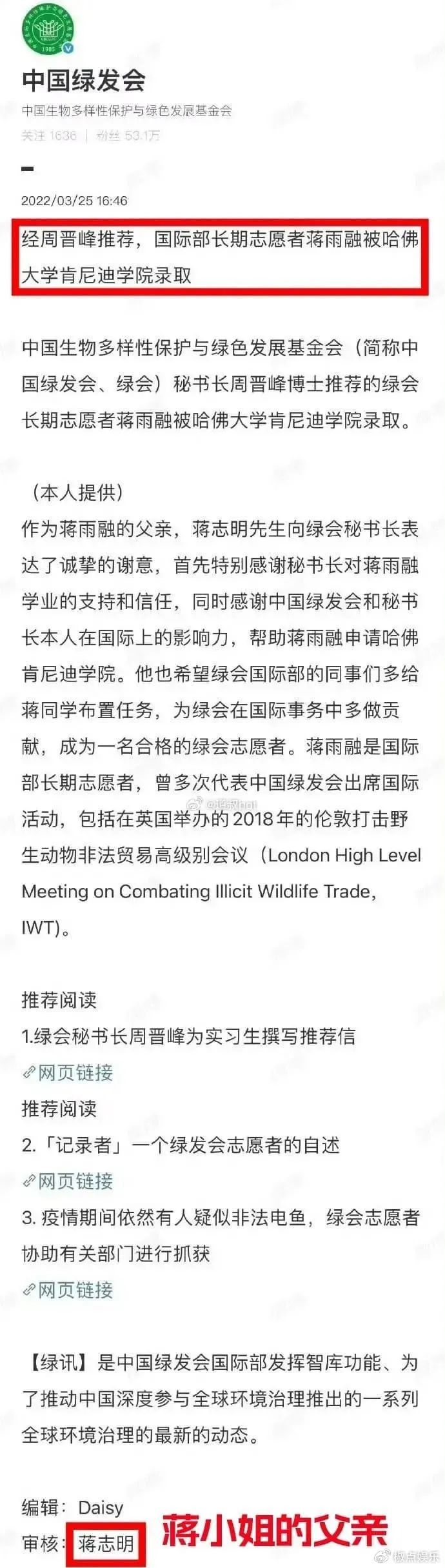 该账号称,绿发会志愿者基本都能得到推荐信,强调对蒋雨融的推荐工作合规恰当,还特别指出蒋雨融父亲在绿发会的任职是志愿性质,未领取工资,甚至喊冤表示有人故意陷害绿发会。