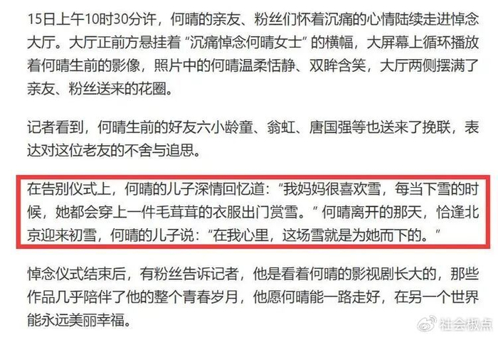 许何在告别时哽咽回忆:“妈妈特别喜欢雪。每次下雪,她都要穿上厚衣服出门看雪。”
