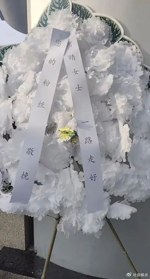 可即便如此,仍有不少影迷自发赶来,在门口默默献上花圈。挽联上写着:“何晴女士,一路走好。”