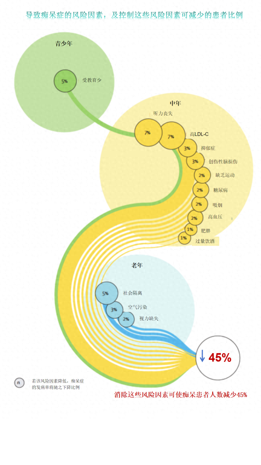 在这份报告中,详细列出了消除这些危险因素后,可以减少痴呆症的患者比例。同时也让我们看到,痴呆的预防,要从青少年开始,中年发力,老年坚守。不同年龄段有不同的 “防护重点”,找对方向才能精准护脑: