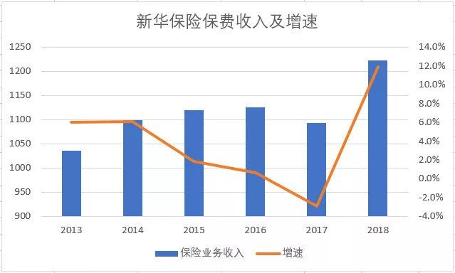 这三年保费收入增长率分别为1.8%、0.6%和-2.9%,公司短期内业务规模缩小也导致了市场份额逐步下降,2017年的市场份额跌至4.2%。不过在摆脱趸交业务的包袱后,新华保险2018年保费收入出现了大幅度增长,从2017年的1092.94亿升至1222.86亿,增长率达到11.89%,保费收入增速在经历转型阵痛后迎来了反弹。