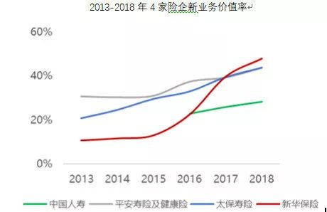 下图显示,2103-2015年新华保险的新业务价值率远低于其他三家保险公司,不过从2016年开始,转型的效果逐步体现,当年新业务价值率大幅提升至22.4%,明显缩小了与其他三家的差距。2017年升至39.7%,到2018年更是跃居首位,达到47.9%。