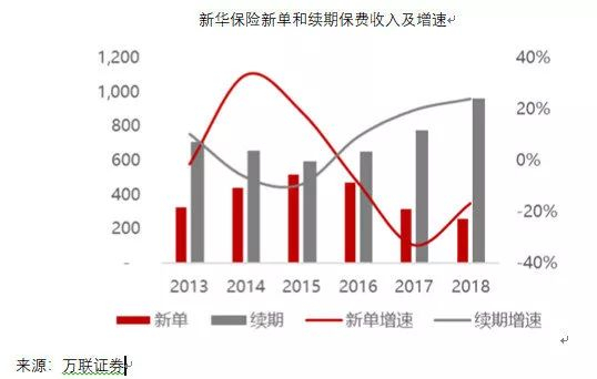 2013年至2015年,新华保险的新单保费处于正增长,而续期保费规模持续下降,公司保费的增长全靠新单拉动。而从2015年开始,新华加快了业务转型速度,控制趸交业务使得新单保费增长率快速放缓,甚至出现负增长,续期保费增速则由负转正且逐年提高。