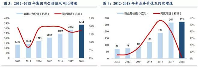 2018年财报显示,公司实现营业收入3543.63 亿元,其中保险业务收入 3218.95 亿元,较上年增长14.3%。公司归母净利润180.19亿元,同比增长22.9%。2018年集团内含价值达到3361.41 亿元,较上年末增长 17.5%,其中有效业务价值1668.16 亿元,较上年增长 24.1%。